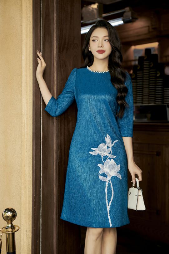 Áo nỉ xanh phối cùng quần jeans tối màu